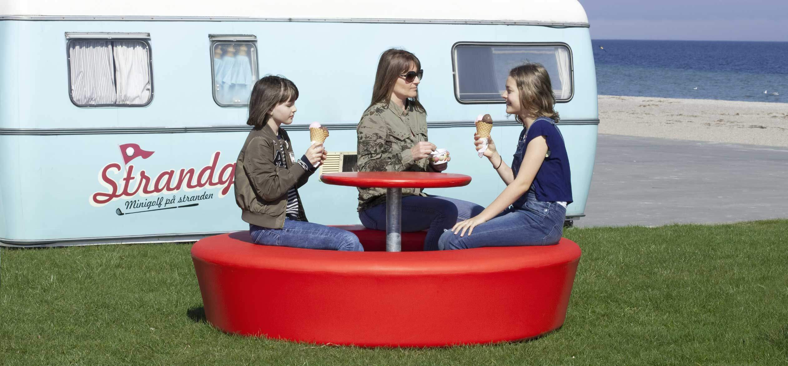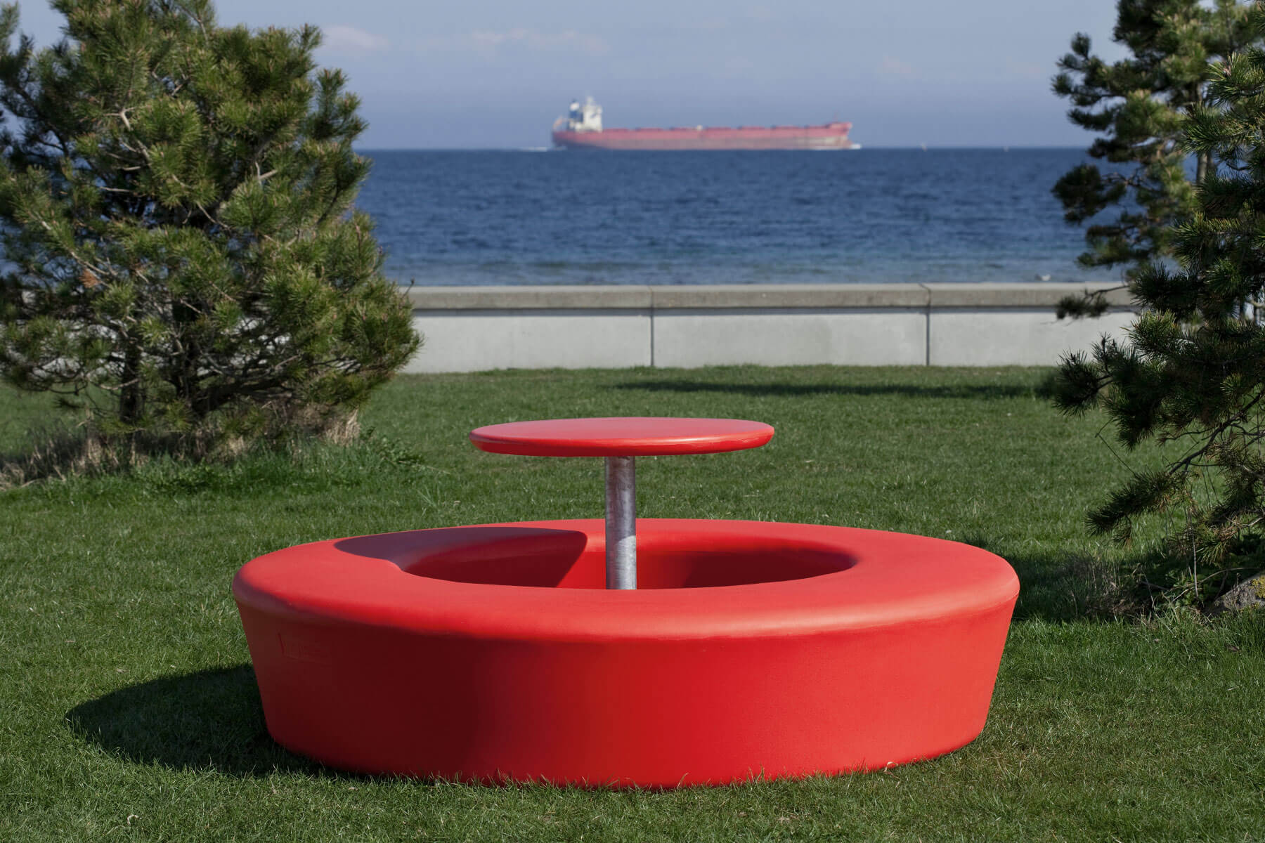 Loop Bord placeret midt i en Loop Circle skaber et lille, rundt bordbænkesæt i samme materiale og mange farvemuligheder