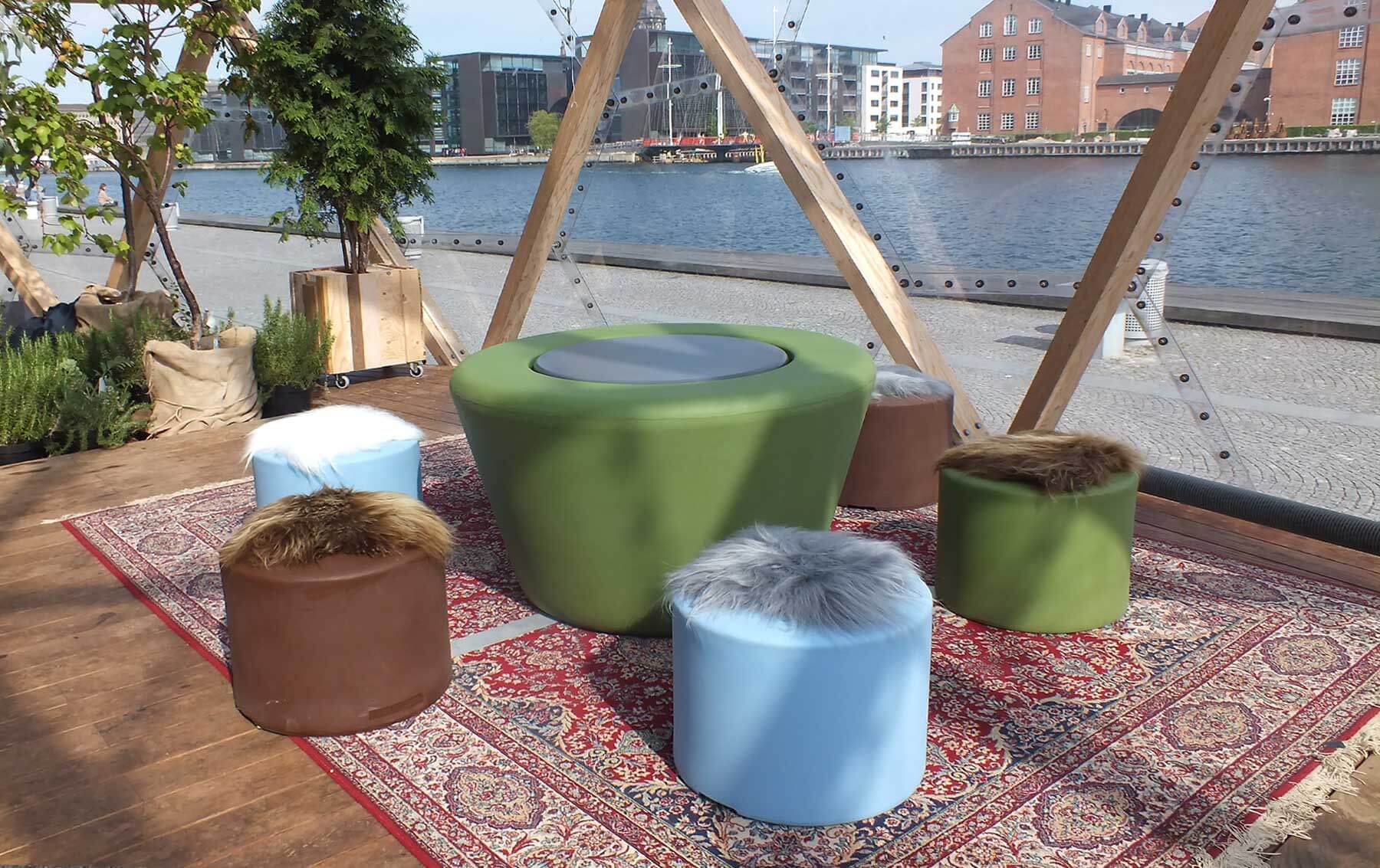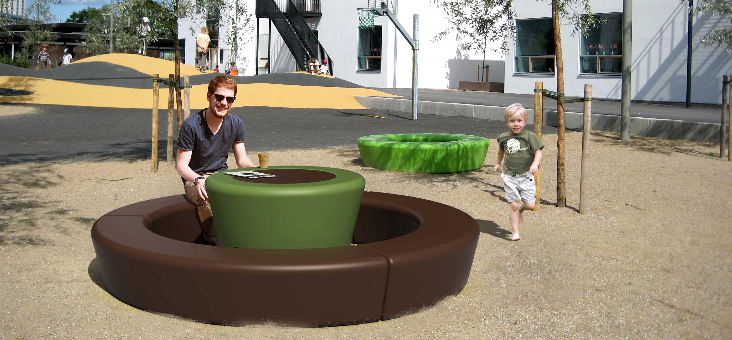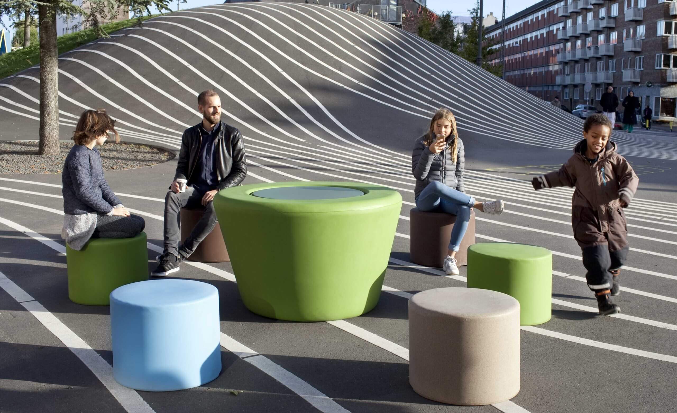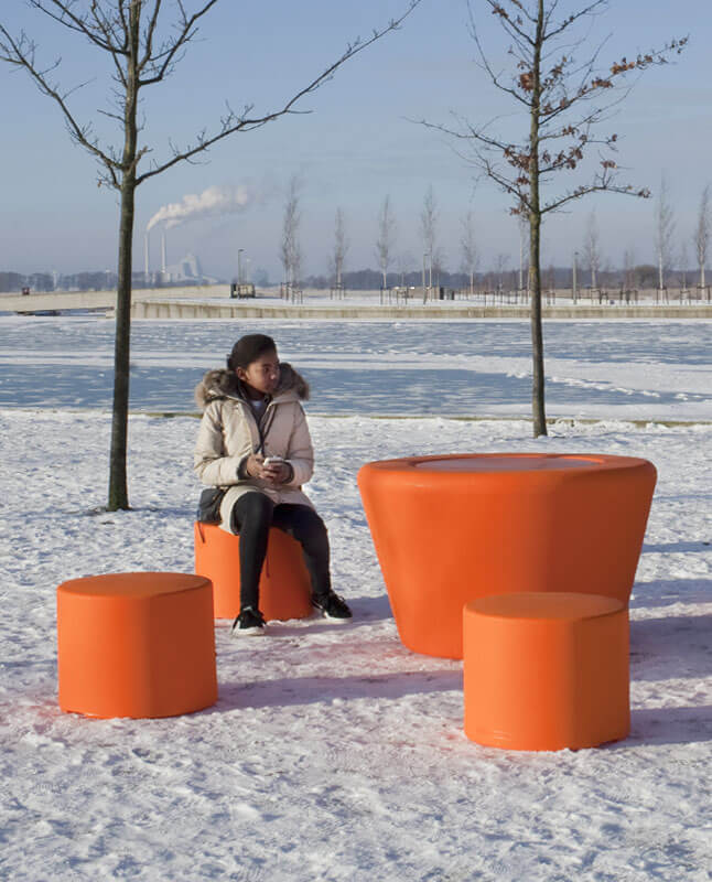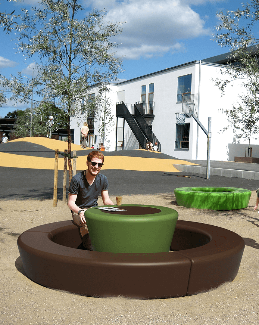 Ved at kombinere Loop Cone Bord med Loop Arc skabes runde og bølgende former med indskudte borde. De bløde og organiske former virker inviterende og er en god kontrast til kantede bygninger og rum. Alternativt kan du bruge HopOp siddepullerter til at skabe en rund siddegruppe omkring Loop Cone bordet.