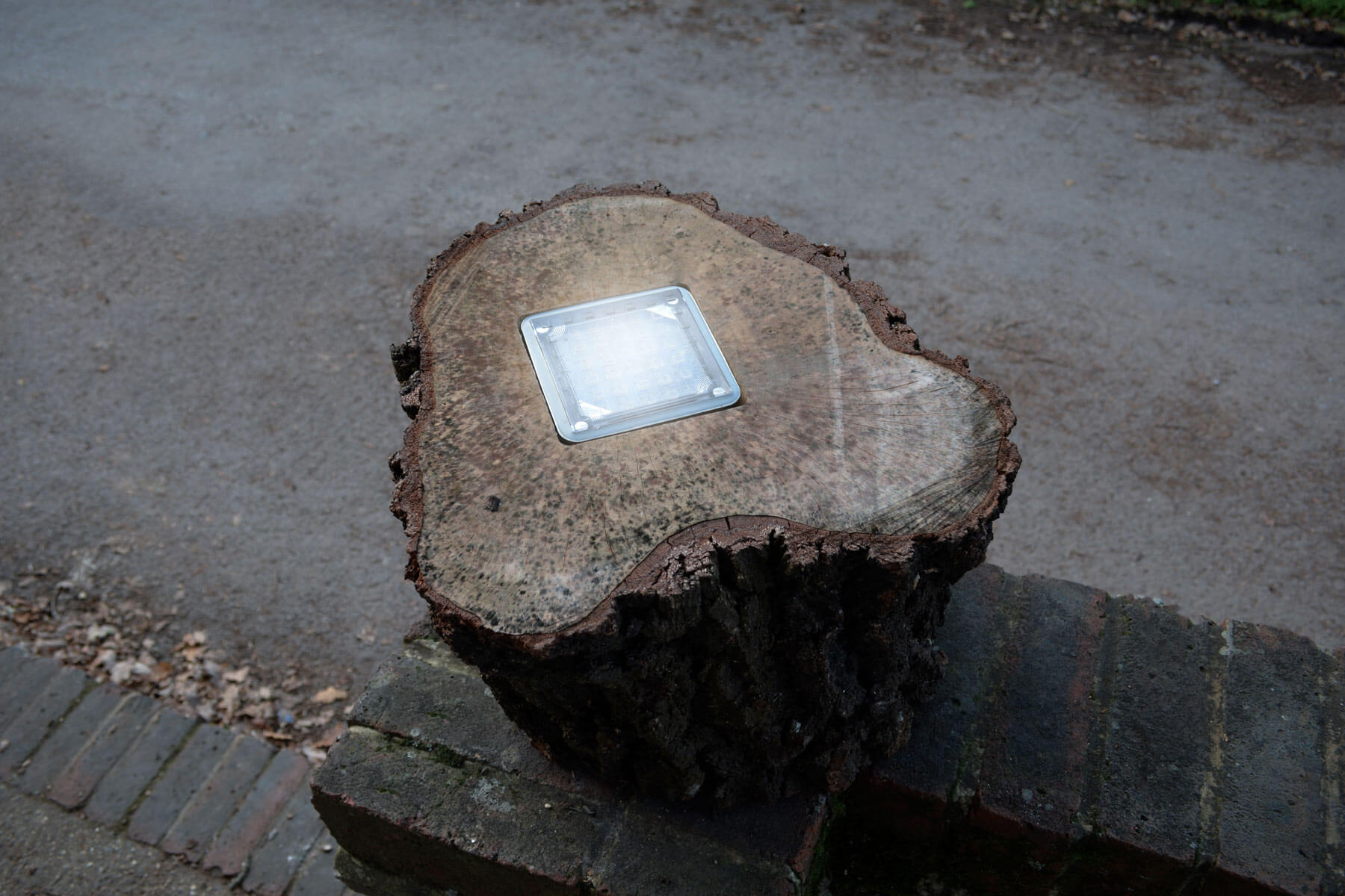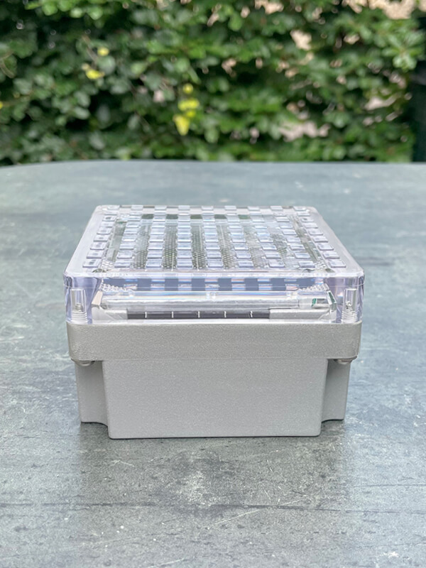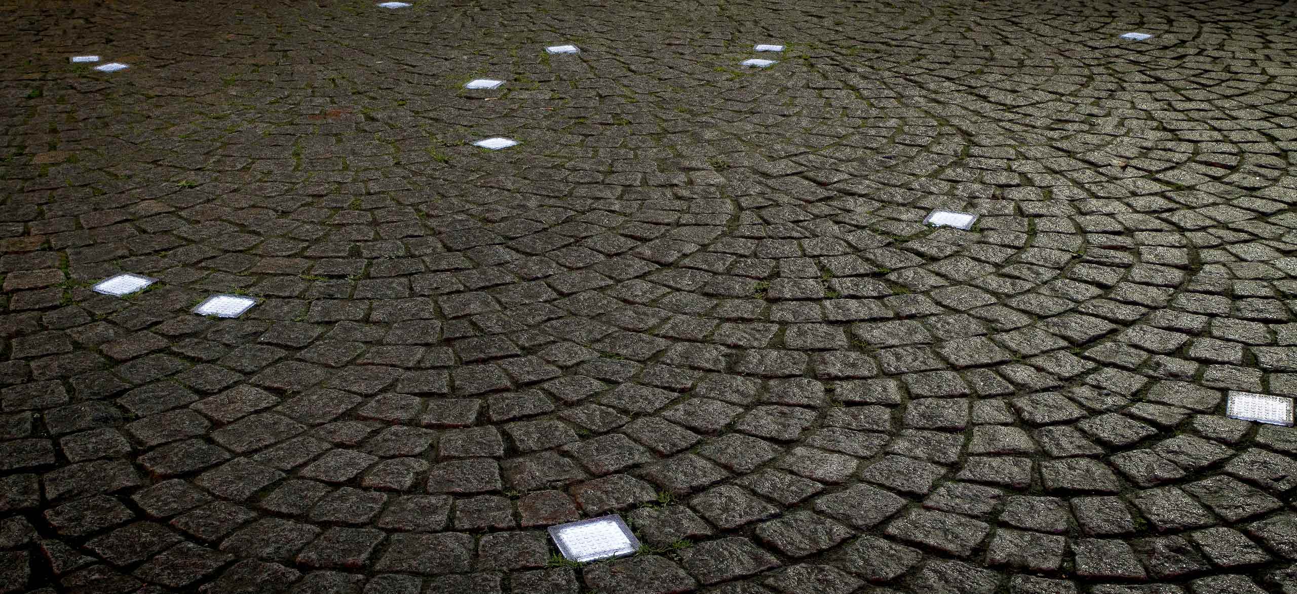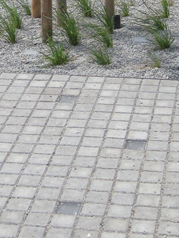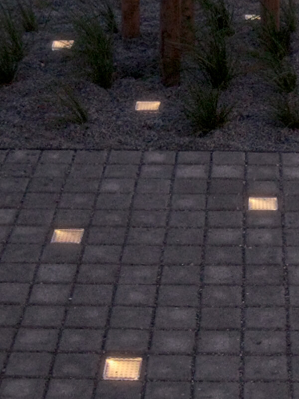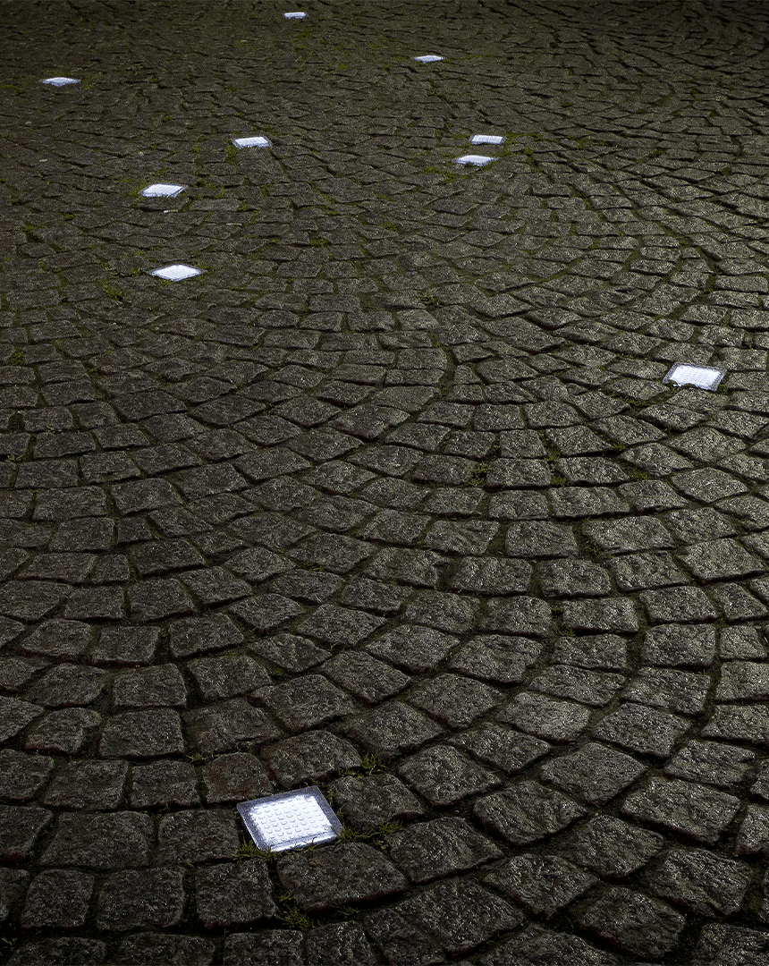 Det kvadratiske design på størrelse med chaussesten er universelt – og kan med fordel monteres i grus, asfalt, jord og græs – eller i vægge.