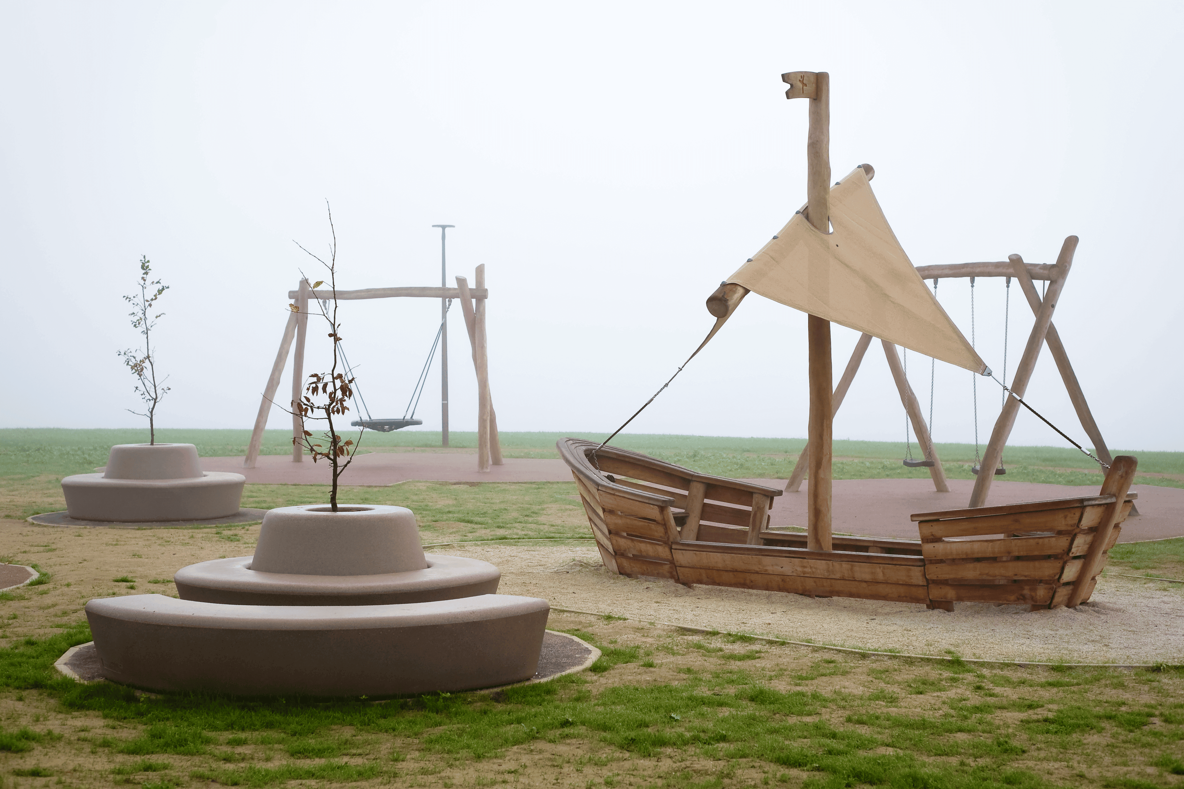 Legepladsen er integreret som en naturlig del af projektet. Her bliver Loop opholdsmøbler elegant indlemmet i omgivelserne