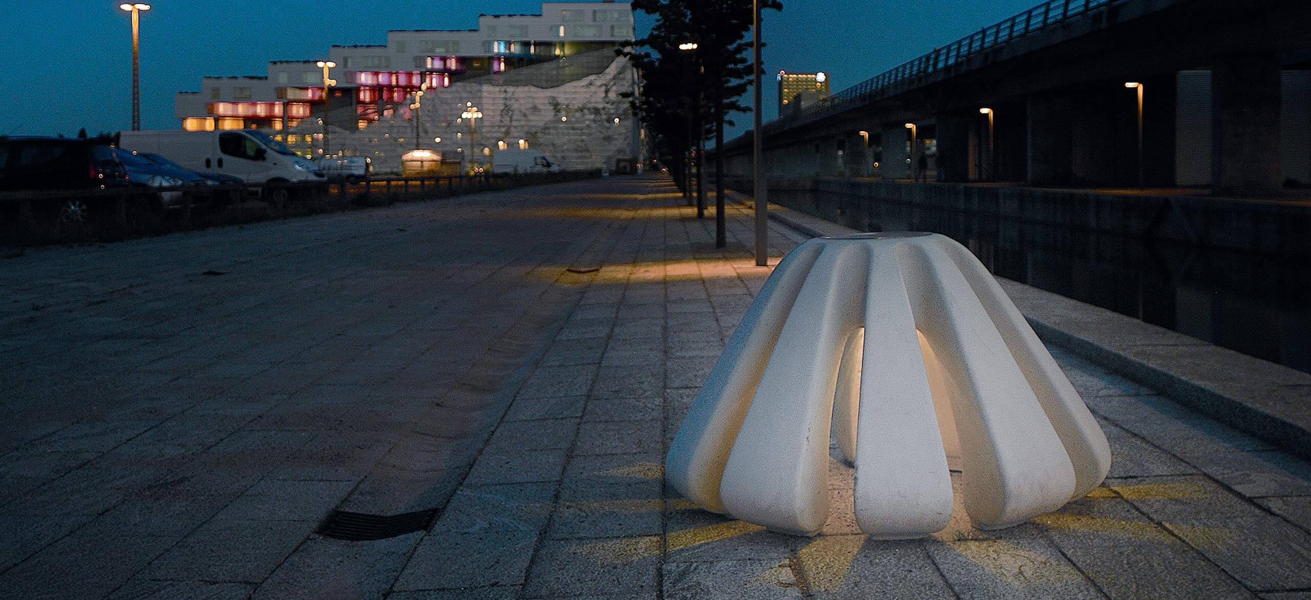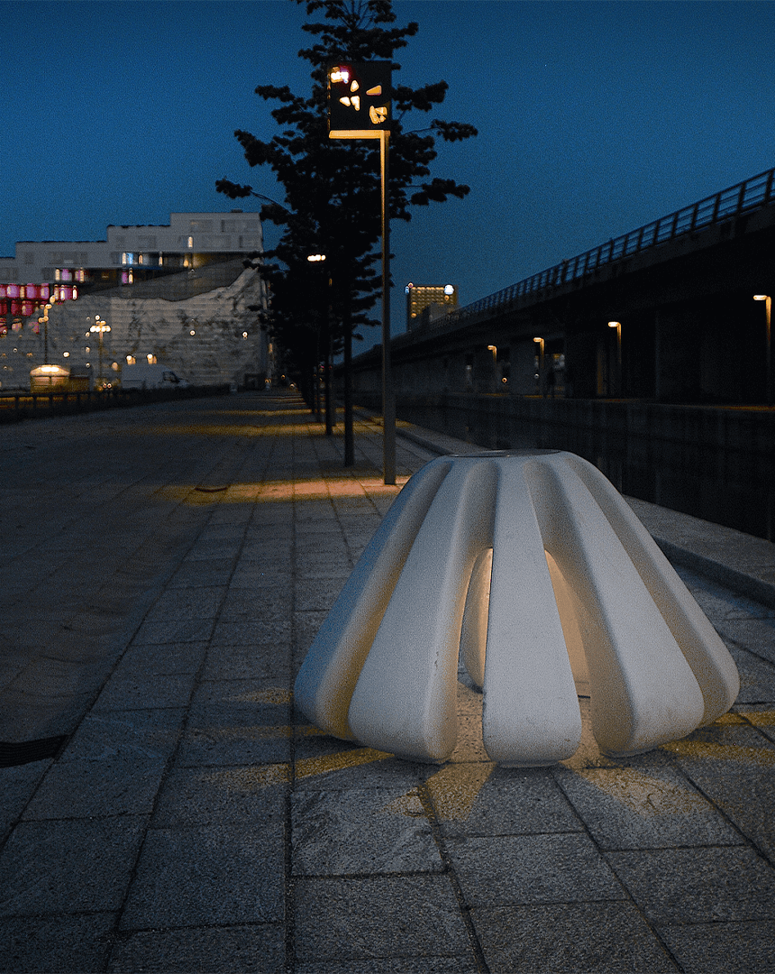 Light streams through the elegant slits in the design, creating a subtly beautiful illumination that forms a star pattern on the ground around it. This element can be used in bike parking areas to offer both lighting and space for up to 11 bicycles. It can also serve as a striking centerpiece or a crucial unit for regulating traffic or reducing speeds near schools