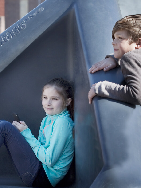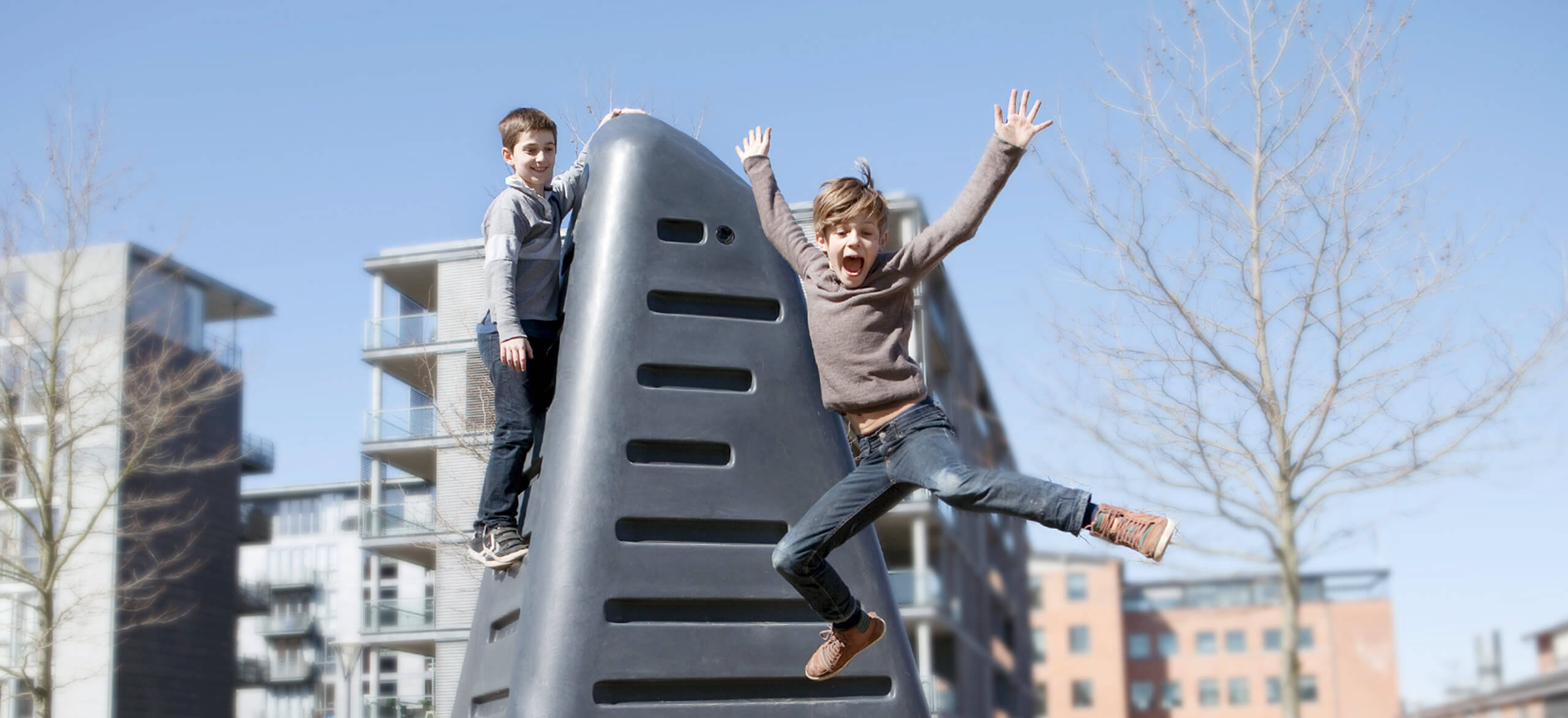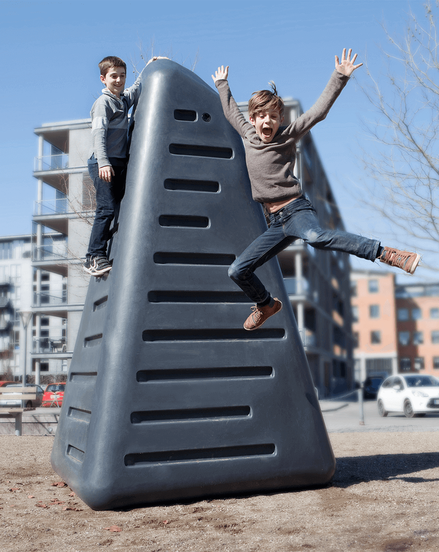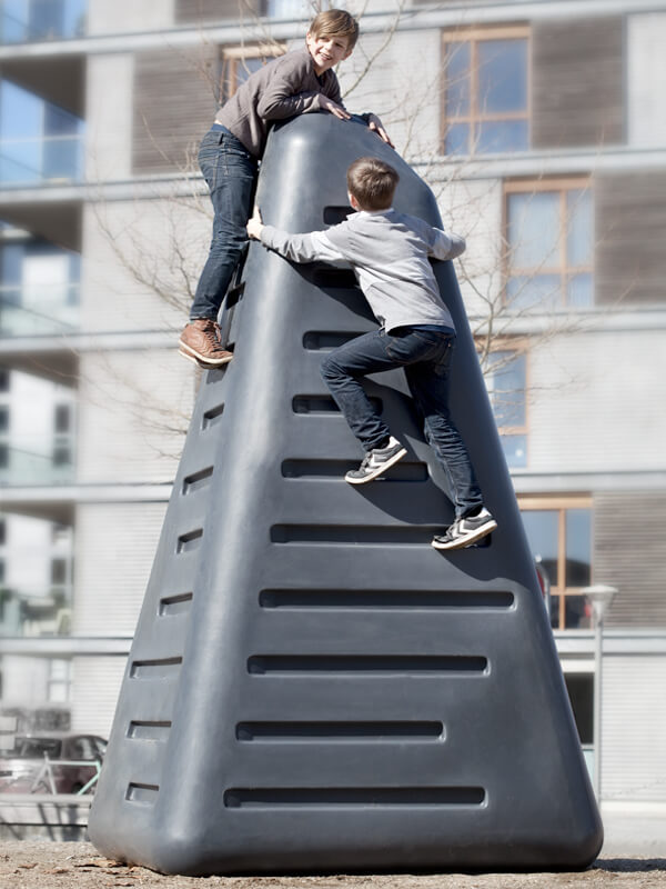 Satellite is a creative urban space element designed for the way children and young people inhabit urban environments. Relaxation and movement combined in one piece of furniture. Satellite can be set up in 4 different ways, allowing one to sit within the cavity, practice parkour, or climb the rungs when the satellite is upright