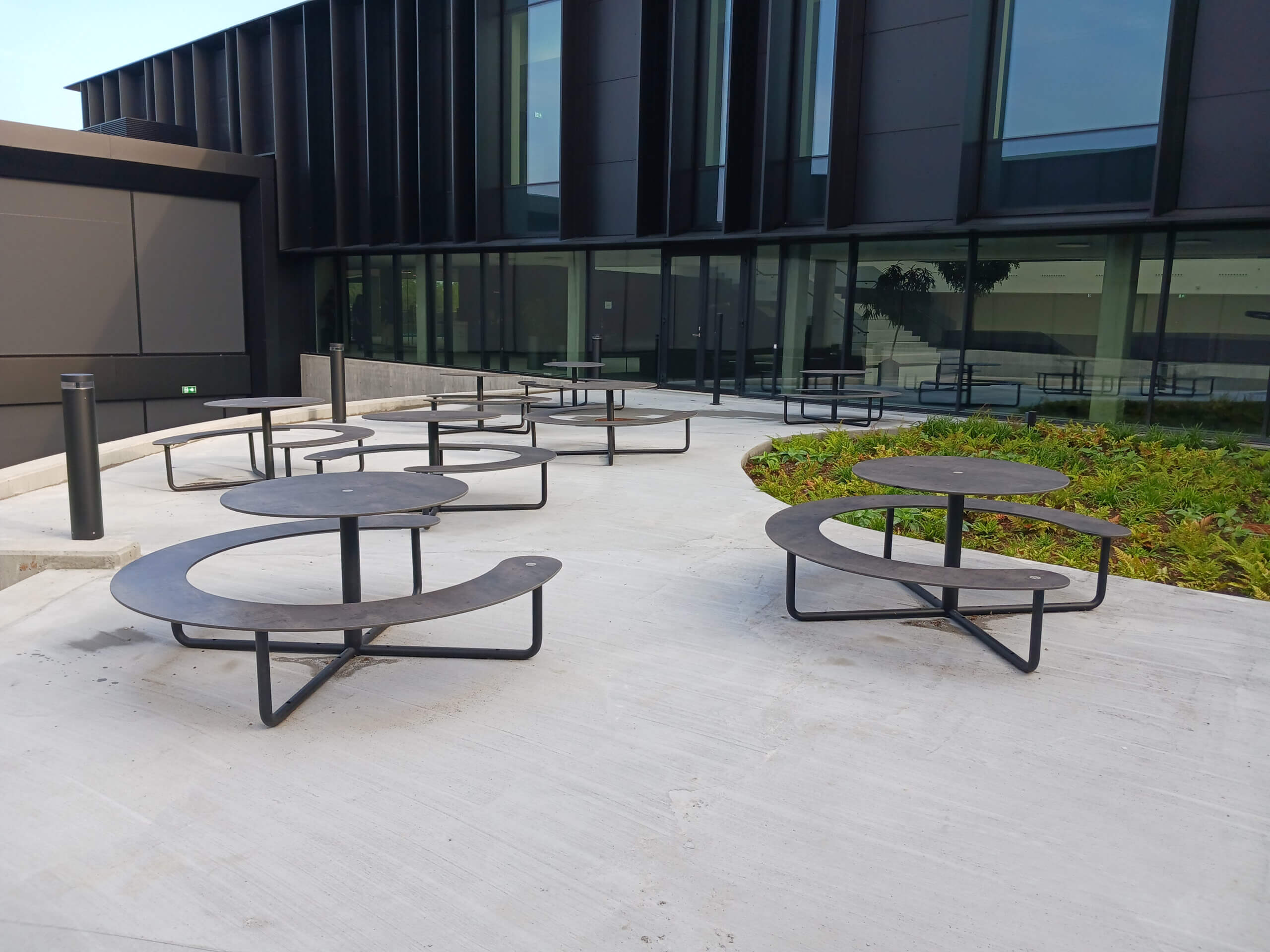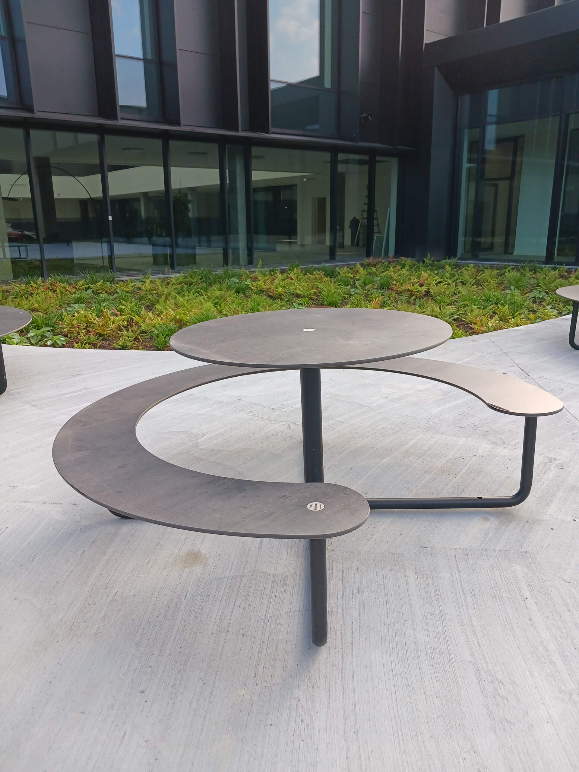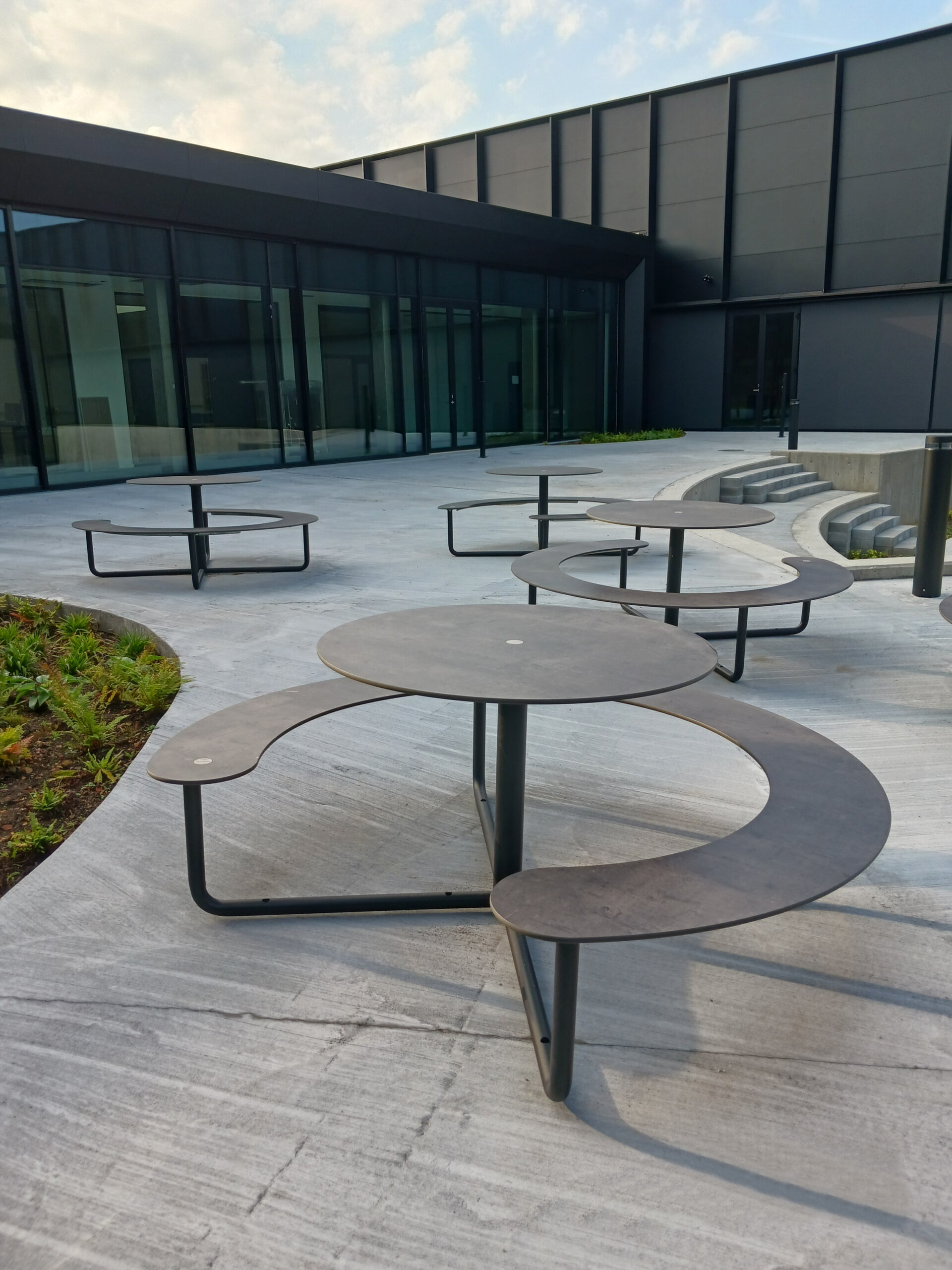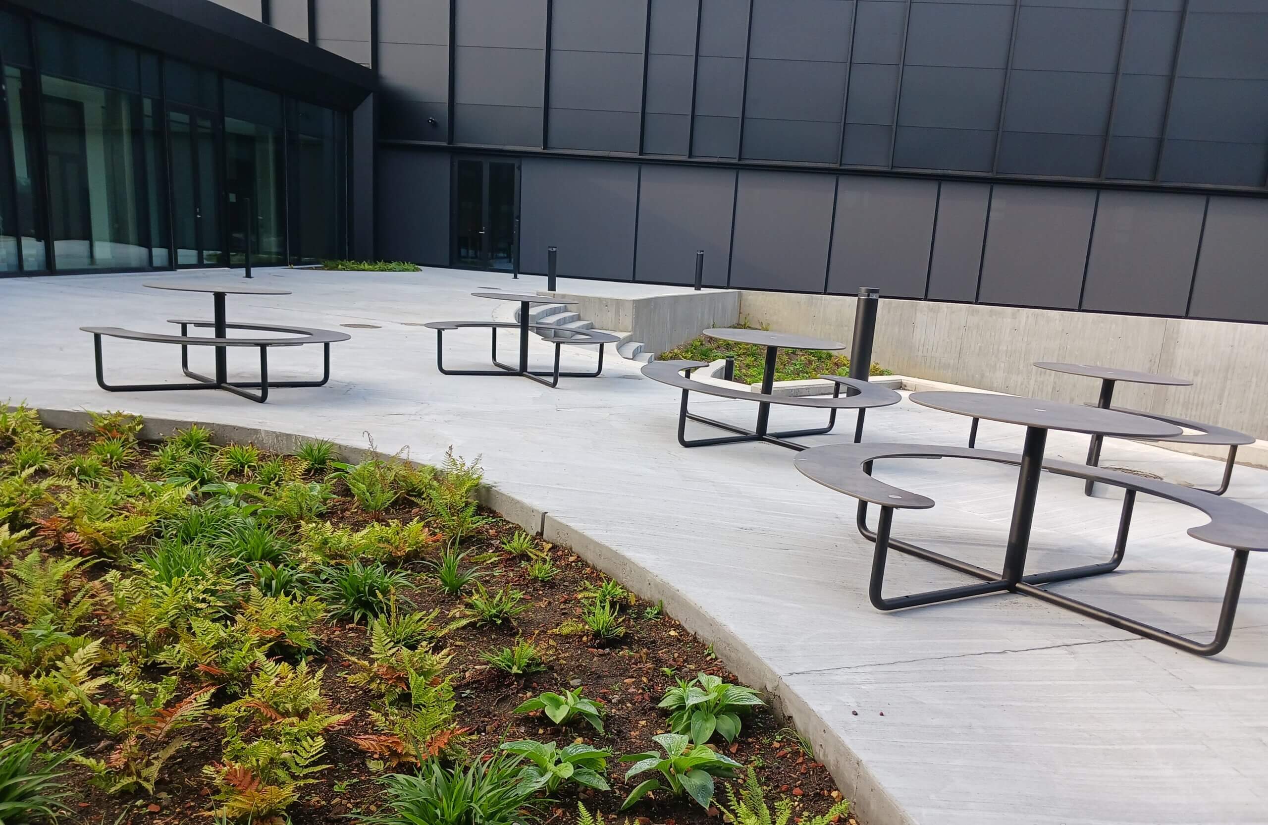 The global Danish company, Asetek, which designs, develops, and sells liquid-based cooling solutions for gaming PCs and data centers, has built a new futuristic headquarters in Aalborg. A brand-new office for 220 employees and a landmark for Aalborg in the south. In connection with the construction, general contractor TL Byg wanted to create an outdoor space where employees could gather during lunch breaks and for outdoor meetings. The result was a multi-level courtyard. To find the right outdoor furniture for the courtyard, TL Byg contacted Palle Poulsen from PP Consult, who, with many years of experience working with architects and contractors, helped identify the ideal outdoor furniture. The choice landed on out-sider’s custom-designed Plateau Picnic Round tables.